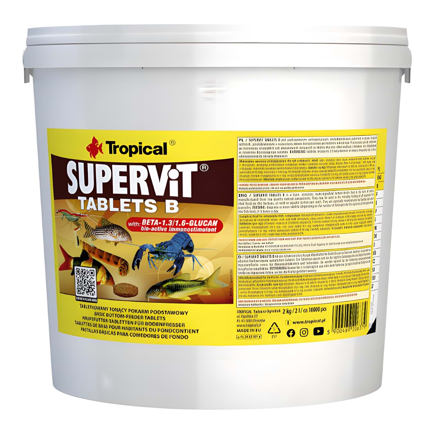 Tropical Supervit Tablet B, akvaryumun dibinden beslenen hem etçil hem de hepçil balıkların günlük beslenmesi için batan tablet formunda, çok bileşenli bir yemdir. Ayrıca salyangoz, kabuklu deniz hayvanları ve su kaplumbağaları için de yem olarak kullanılabilir. Son derece zengin ve çeşitli formülü, hayvanlara tüm temel besinleri sağlar. Beta-glukan ilavesi, balıkların bağışıklığını güçlendirir. Bu temel balık yemi, çok türlü bir akvaryum için ideal bir seçimdir.